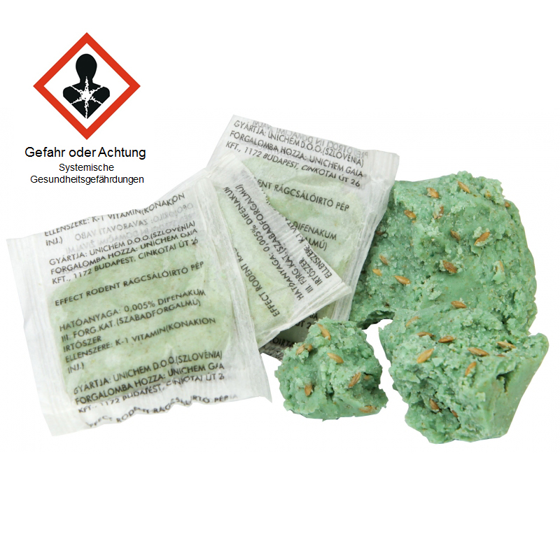 Absolut einzigartige Pastenformulierung mit extrem hohem Getreideanteil, der auch deutlich geruchlich wahrnehmbar ist. Mit diesem Präparat werden die Eigenschaften eines Cerealienköders mit den Vorteilen der pastösen Konsistenz ideal miteinander verschmolzen. Trotz der für die Schad-nager attraktiven Köderkonsistenz kein unappetitliches und unhygienisches Ausölen in der Mäusebox oder im Vorratseimer. Anwendung: Hausmäuse: in und um Gebäude Wanderratten: in und um Gebäude, offenes Gelände, Mülldeponien Plug and Play entweder als 100 g Blisterverpackung oder 10 g Portionsbeutel. Technische Details Präparatetyp:Zerealienköder mit pastöser Konsistenz, Fraßpaste Zielorganismen: Hausmäuse, Wanderratten Anwendungsbereiche: in und um Gebäude, offenes Gelände (nichts sachkundige Anwender: in und um Gebäude)