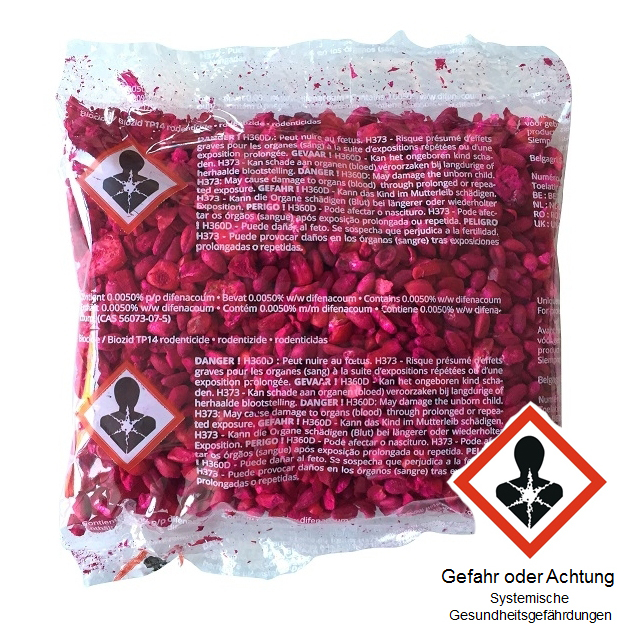 Es handelt sich um ein Rodentizid der 2. Generation. Die Anwendung ist nur durch berufsmäßige Verwender und sachkundige Verwender zulässig. Eine Anwendung durch Verbraucher oder sonstige nicht sachkundige Personen ist nicht gestattet. Mit dem Kauf bestätigen Sie Wiederverkäufer oder berufsmäßige Verwender mit entsprechender Sachkunde nach ChemVerbotsV bzw. nach PflSchG oder Mitarbeiter öffentliche Forschungs-, Untersuchungs- und Lehranstalten sind bzw. die Produkte nicht selbst anwenden sondern von einer der vorgannten Gruppe zugehörigen Personen anwenden lassen.